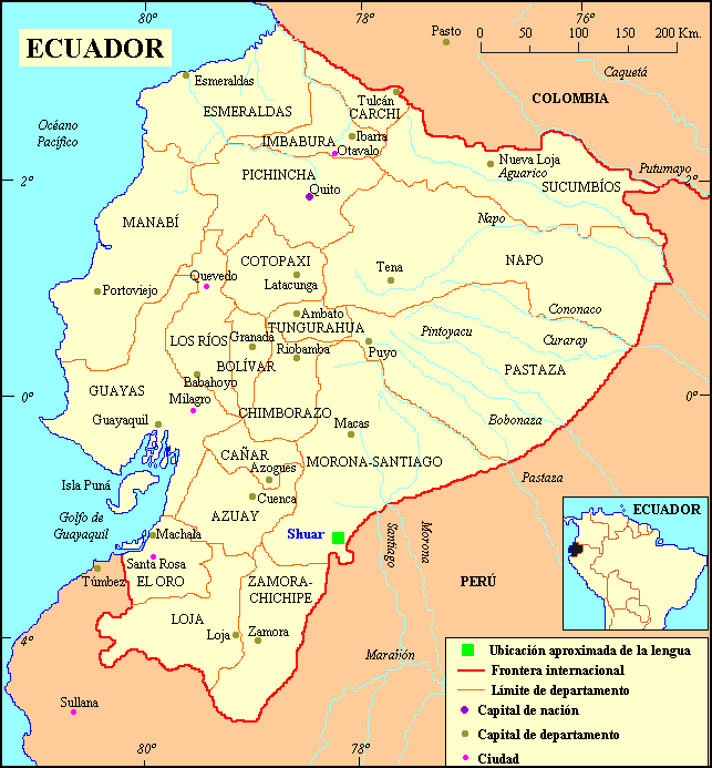 La lengua shuar (shuar chicham) se habla en el sudeste de Ecuador, entre los ríos Pastaza y Marañón, al este de la ciudad de Cuenca a lo largo de la frontera con Perú; se trata de una región rocosa a lo largo de las faldas de los Andes.